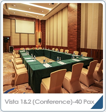 Vista, our largest meeting room, is able to efficiently accommodate up to 100 participants while Vista 1 and Vista 2 could easily accommodate 40 participants respectively.
